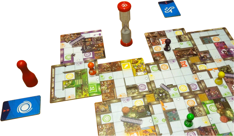 Wir verlieren, wenn die Sanduhr durchläuft, bevor alle unsere Helden die Ausgänge erreicht haben. Außerdem sind weder die Zielorte noch die Ausgänge am Anfang bekannt, das Kaufhaus muss erst noch nach und nach erkundet werden. Das größte Problem ist aber: Die meiste Zeit dürfen wir nicht miteinander reden! Einzig erlaubtes Hilfsmittel ist die „Mach was!“-Figur, die wir vor einen Spieler stellen können – in der Hoffnung, dass dieser versteht, was jetzt zu tun ist ...