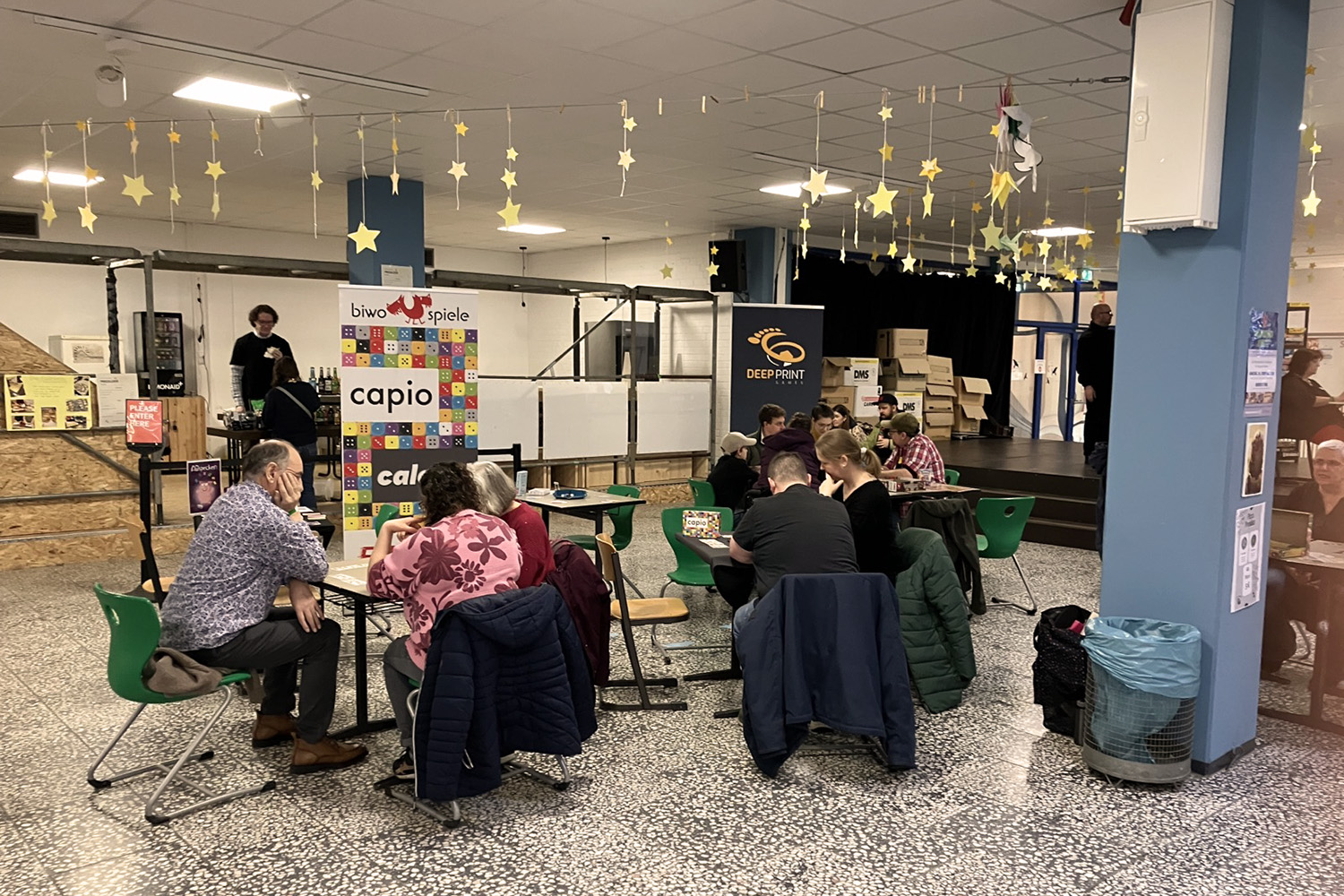 Die Bühne wurde freigegeben, so dass dieses Mal noch mehr Tische zur Verfügung standen, die zeitweise alle belegt waren. Wie immer waren alle Altersklassen vertreten und es wurde viel gespielt. Mehr als 150 Besucher nutzten die Zeit, neue Spiele kennenzulernen und Altbekanntes mal wieder zu spielen. Allen hat’s gefallen, so dass es auch 2026 weitergehen sollen, wohl wieder im November.