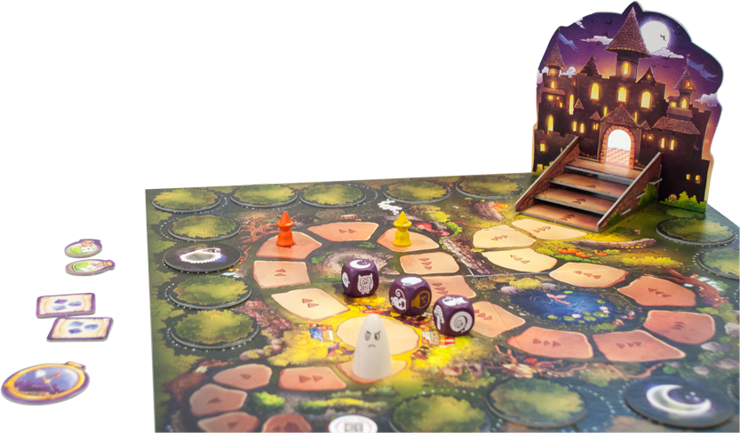 Mit einer Kombination aus Würfeln und Aufdecken von Karten bewegt sich die Gruppe vorwärts. Alle arbeiten zusammen, damit der Wächtergeist niemanden erwischt. Man kann vorausplanen und hat darum keinen Stress. Erst auf der Treppe zur Zauberschule muss man still sein – sonst wird man in der Burg gehört. Wird es knapp, helfen Zaubertränke.