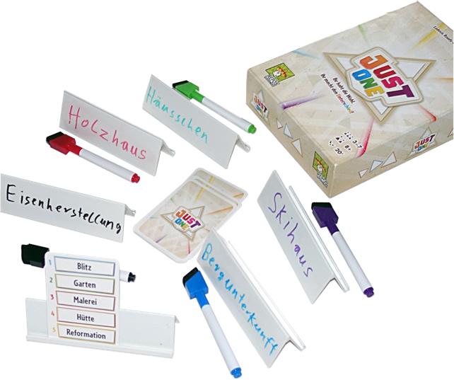 Just One, der Name ist Programm. Gemeinsam versucht ihr, einen Begriff zu erraten. Reihum schlüpft jeder in die Rolle des Ratenden, alle anderen dürfen geheim nun genau ein Wort auf ihre Tafel schreiben, das dem Ratenden einen Hinweis auf das gesuchte Wort gibt. Aber Vorsicht! Die Tipps müssen einmalig sein, ohne dass man sich beraten darf. Tipps mit gleichen Wortteilen müssen gelöscht werden, der Ratende hat weniger Begriffe zur Verfügung, um auf das Lösungswort zu kommen.
